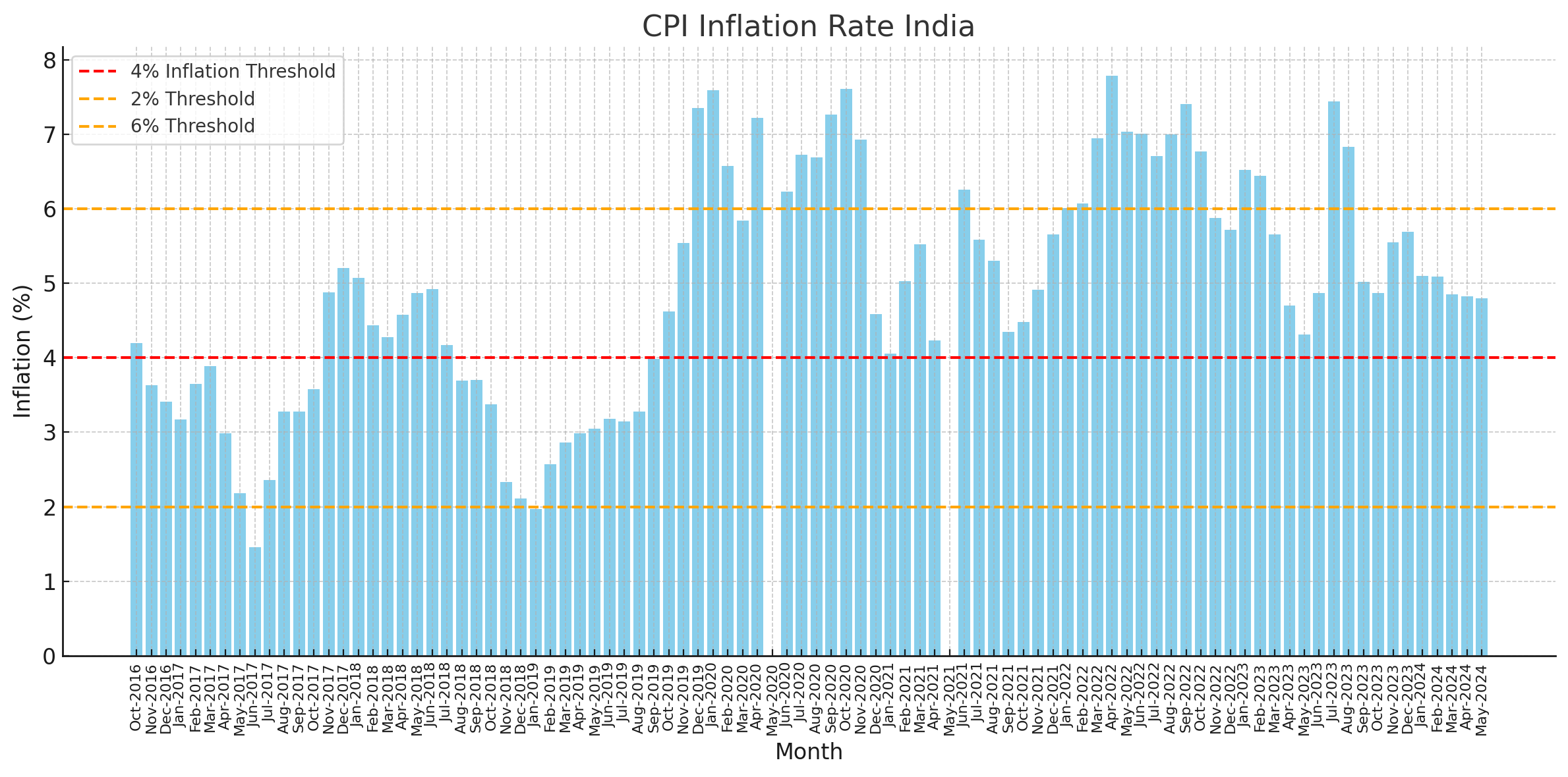 In the period October 2016 to May 2024, annual CPI inflation rate has exceeded 6% in 25 months of the 92 months period. That’s 27% times. All of these periods have been after December 2019. And in 2020 and 2022, inflation remained more than 6% for over 9 months consecutively. Why did the RBI fail in this period, and what did it plan to do differently? We don’t know. I’ll explain later in this piece.