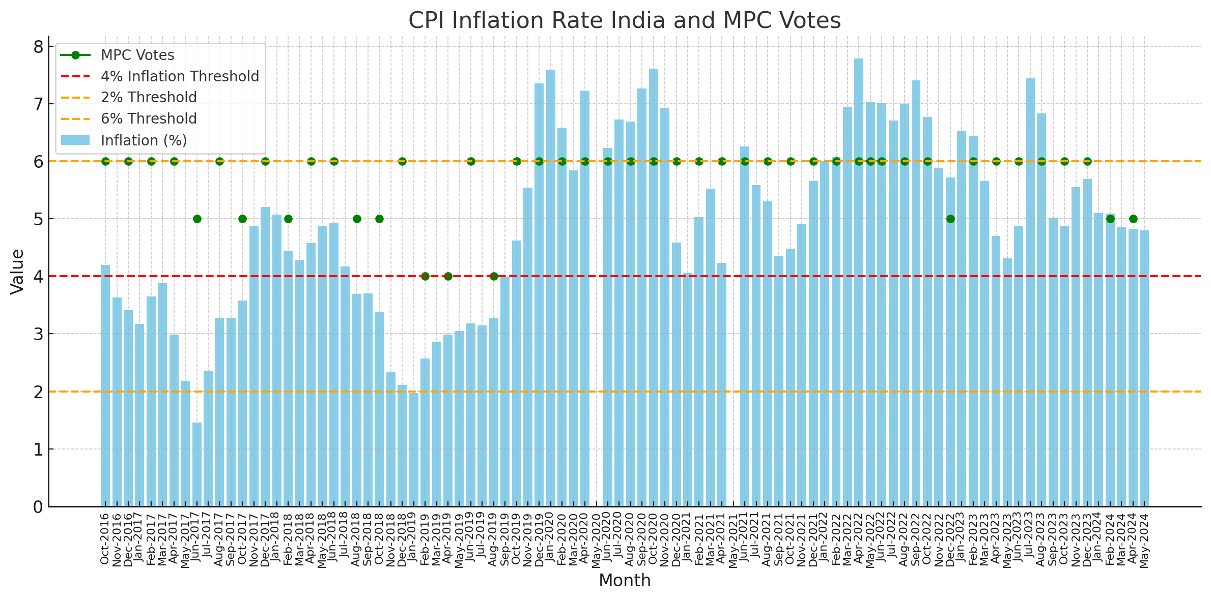 Data used in this post: CPI Inflation (Oct 2016 - May 2024) and MPC Votes Data (Oct 2016 - June 2024). The minutes of all the MPC meetings in the period can be found here.